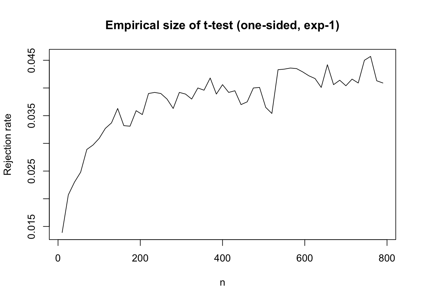max_n <-8e2ns <-seq(10, max_n, by =15)res <-sapply(ns, \(n) {mean(replicate(1e4, { z <-rexp(n) -1sqrt(n) *mean(z) /sd(z) >qt(0.95, n -1) }))})plot(ns, res, type ="l",xlab ="n", ylab ="Rejection rate",main ="Empirical size of t-test (one-sided, exp-1)")abline(h =0.05, col ="red", lty =2)
