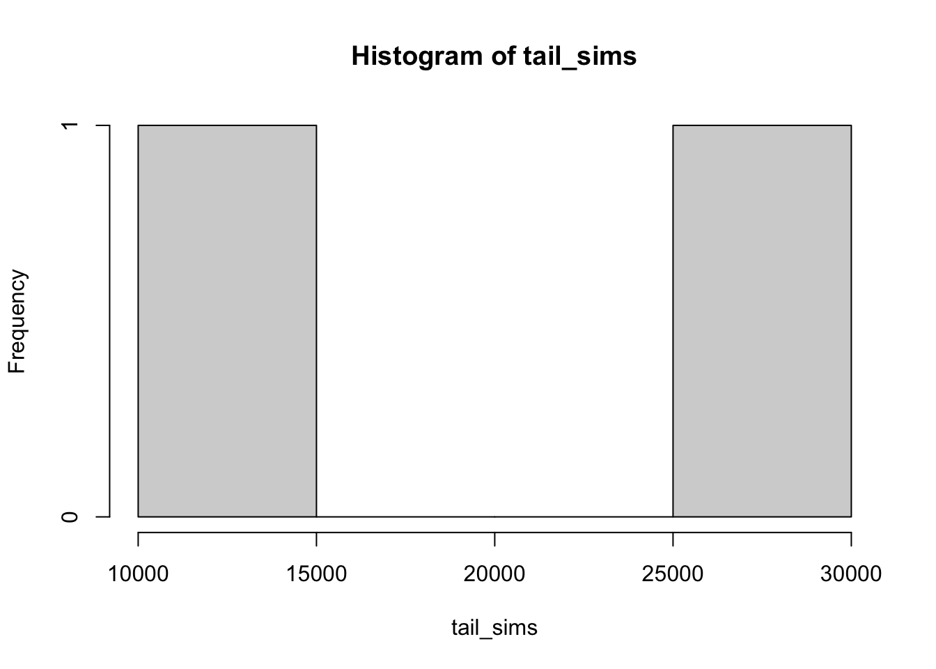 tail_sims <-replicate(1e3,{ n <-1e4 x <-rbinom(1e5, size =1, 1/n^2)which(x ==1)[1]})hist(tail_sims)