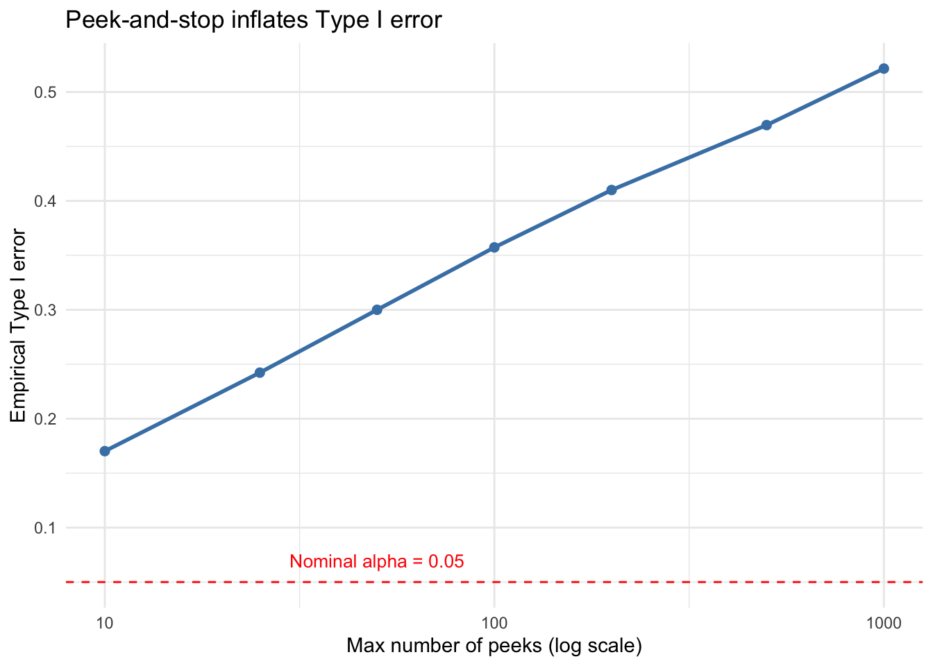 library(ggplot2)peek_counts <-c(10, 25, 50, 100, 200, 500, 1000)type1 <-sapply(peek_counts, function(n) {mean(replicate(n_sim, peek_and_stop(n, z_crit)))})ggplot(data.frame(peeks = peek_counts, type1 = type1), aes(peeks, type1)) +geom_line(color ="steelblue", linewidth =1) +geom_point(color ="steelblue", size =2) +geom_hline(yintercept =0.05, linetype ="dashed", color ="red") +annotate("text", x =50, y =0.07, label ="Nominal alpha = 0.05",color ="red", size =3.5) +scale_x_log10() +labs(x ="Max number of peeks (log scale)",y ="Empirical Type I error",title ="Peek-and-stop inflates Type I error") +theme_minimal()