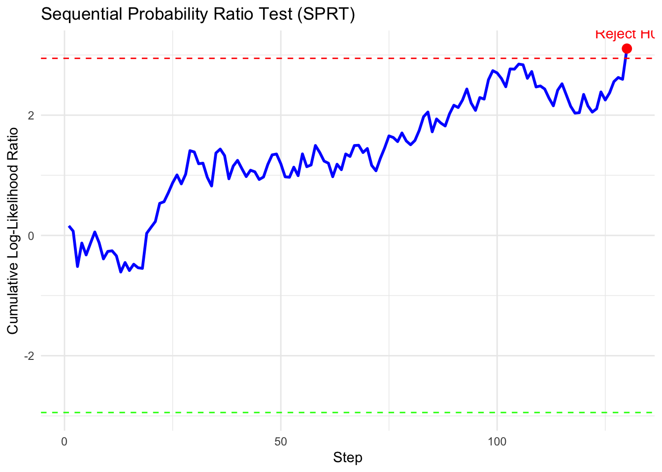 h0_results <-replicate(n_sim, { x <-rnorm(500, mean =0, sd)sprt_normal(x)$decision})cat(sprintf("Reject H0 : %.3f (should be <~%.2f)\n",mean(h0_results =="Reject H0"), alpha))