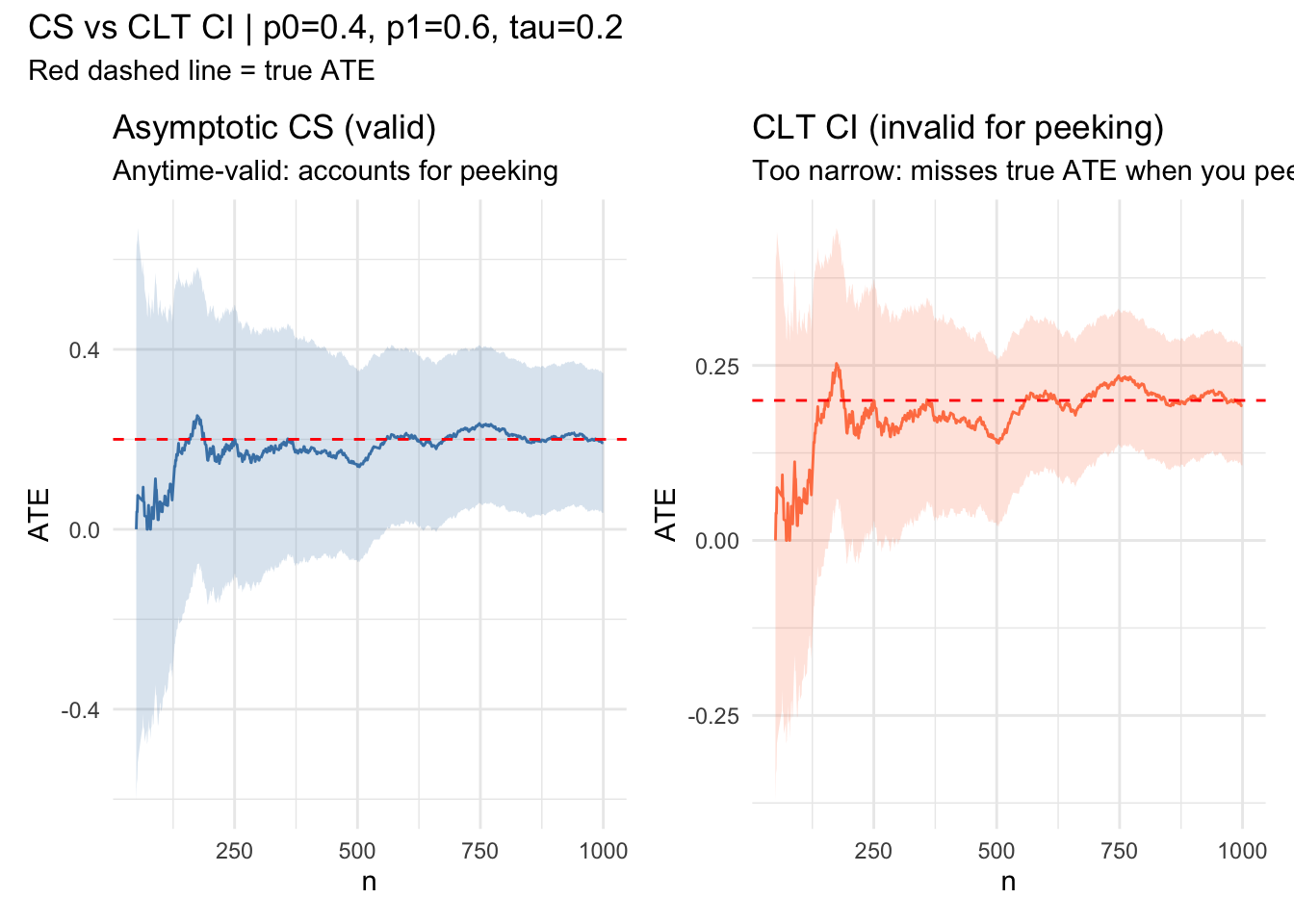 library(ggplot2)library(patchwork)# --- Parameters ---n <-1e3; p0 <-0.4; p1 <-0.6; e <-0.5tau <- p1 - p0running_sd <-function(x) { n <-seq_along(x) M2 <-numeric(length(x)) mu <-cumsum(x) / nfor (t in2:length(x)) { d <- x[t] - mu[t -1] M2[t] <- M2[t -1] + d * (x[t] - mu[t]) }sqrt(pmax(M2 /pmax(n -1, 1), 1e-10))}robbins_confseq <-function(x, alpha =0.05, rho =1) { n <-seq_along(x) mu_hat <-cumsum(x) / n s_n <-running_sd(x) radius <- s_n *sqrt((2* (n * rho^2+1) / (n^2* rho^2)) *log(sqrt(n * rho^2+1) / alpha))data.frame(lower = mu_hat - radius, upper = mu_hat + radius)}Z <-rbinom(n, 1, e)Y <-ifelse(Z ==1, rbinom(n, 1, p1), rbinom(n, 1, p0))phi <- Z * Y / e - (1- Z) * Y / (1- e)cs <-robbins_confseq(phi)# CLT CI: just z * se, no correction for peekingns <-1:nmu_hat <-cumsum(phi) / nsclt_hw <-qnorm(0.975) *running_sd(phi) /sqrt(ns)df <-data.frame(t = ns,ate = mu_hat,cs_lo = cs$lower, cs_hi = cs$upper,clt_lo = mu_hat - clt_hw,clt_hi = mu_hat + clt_hw)[50:n, ]p1_plot <-ggplot(df, aes(t)) +geom_ribbon(aes(ymin = cs_lo, ymax = cs_hi), alpha =0.2, fill ="steelblue") +geom_line(aes(y = ate), color ="steelblue") +geom_hline(yintercept = tau, color ="red", linetype ="dashed") +labs(x ="n", y ="ATE",title ="Asymptotic CS (valid)",subtitle ="Anytime-valid: accounts for peeking") +theme_minimal()p2_plot <-ggplot(df, aes(t)) +geom_ribbon(aes(ymin = clt_lo, ymax = clt_hi), alpha =0.2, fill ="coral") +geom_line(aes(y = ate), color ="coral") +geom_hline(yintercept = tau, color ="red", linetype ="dashed") +labs(x ="n", y ="ATE",title ="CLT CI (invalid for peeking)",subtitle ="Too narrow: misses true ATE when you peek") +theme_minimal()p1_plot + p2_plot +plot_annotation(title =sprintf("CS vs CLT CI | p0=%.1f, p1=%.1f, tau=%.1f", p0, p1, tau),subtitle ="Red dashed line = true ATE" )