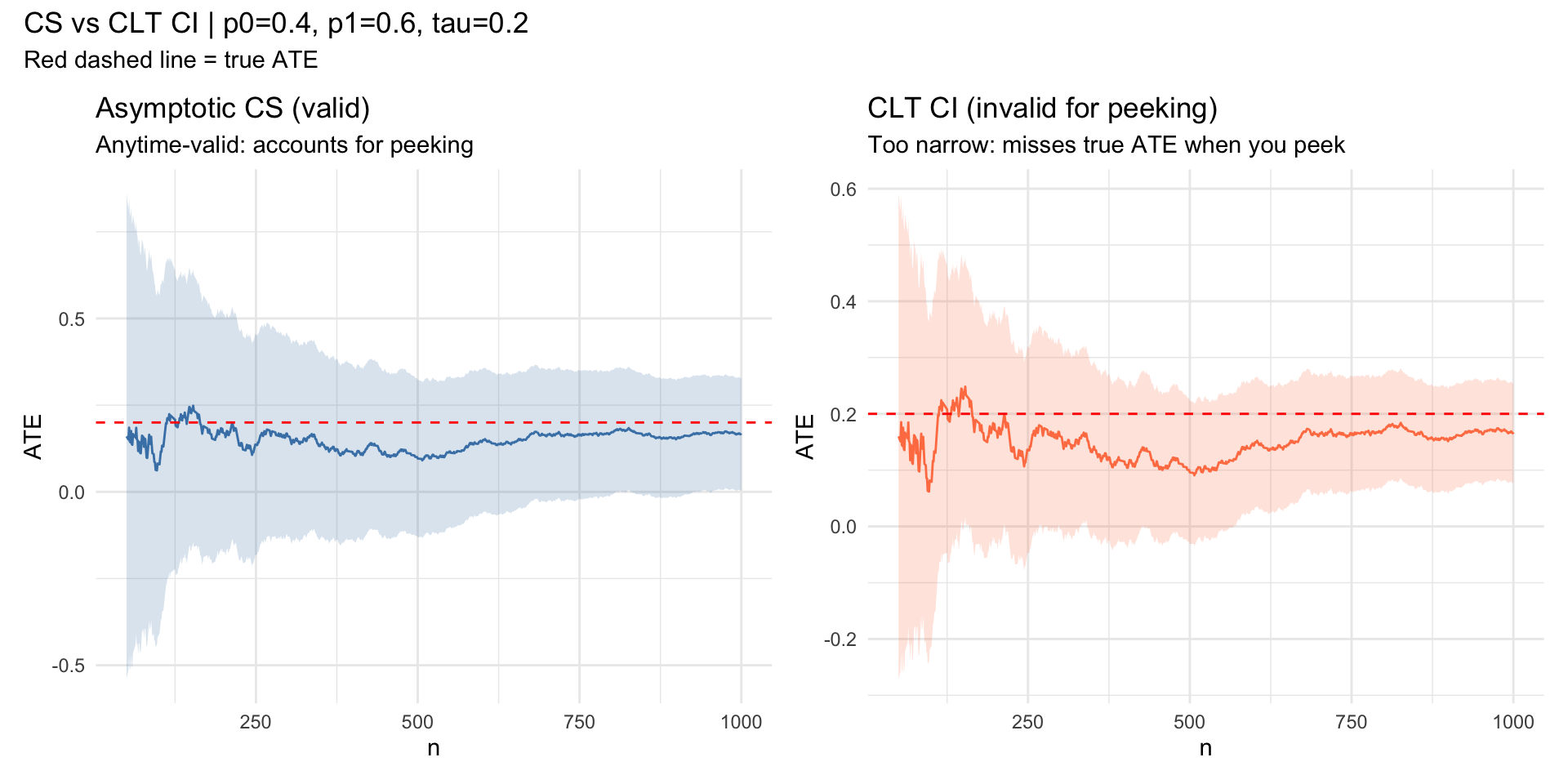 subtitle = "Too narrow: misses true ATE when you peek") +